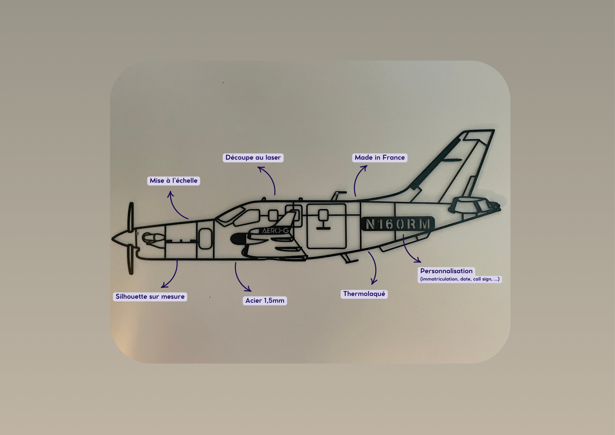 Chez Aero G, nous croyons que chaque pilote est unique, et votre décoration devrait l'être aussi. C'est pourquoi nous vous offrons la possibilité de créer votre propre silhouette d'avion personnalisée, conçue spécialement pour vous.